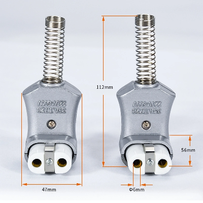 Electric Heater Plug includes different types: aluminum case and silicone rubber housing. It is designed for plug-in electric heater, the jack dia is 4mm-6mm. With high strength, high temperature resistance, plug can be used in high electric current(3A-35A),and has long working life. Technology for Electric Heater PlugInside: composed by copper core contact surface and the ceramic beadsOutside:madeof the outer metal aluminum protective case or silicone rubber protective shell.Current35AMaterialAluminum and ceramicVoltage220V---600VApplicationFood Machinery,Chemical Industry
