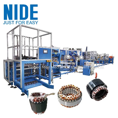 Stator line main feature1.This production line is consisted of two parts, conveyor and stand-alone machines respectively. The stator transferring and transforming process is fulfilled by mechanical arm between conveyor and stand-alone machines. While machine action is accomplished by handshaking control between conveyor and stand-alone machines.2.Each working station of this stator line has a self-contained control function, and can work independently.3.The conveyor is equipped with an independent control system. It can lift, position, and stop stators.4.With an automatic positioning function, the paper inserting station can load and unload stators.5.Mechanical robot is used to connect the paper inserting station and auto coil inserting station during production. It is stable during running. Stator position put by the mechanical arm is more accurate.6.Mechanical arm is used to connect the forming station and conveyor during production.7.Mechanical arm is used to connect the lacing station and conveyor during production. Lacing and knotting process can be automatically done.8.This stator line can automatically test the stator, then it will judge the qualified and unqualified stators so as to do next process. This stator production line is consisted of several machines, paper inserting machine, stator coil winding and coil inserting machine, lacing machine, forming machine. Technical data of stator paper inserting machine:Stator stack length:20~90mmStator OD: max 135mmStator ID: 20~90mmFolding height/width: 2~4mm/4~7mmInsulation paper thickness:0.188~0.35mmEfficiency:≈0.5s/sPower: 380V/50/60HZ 0.75KWMachine weight: ≈200kgMachine dimension: (L)1200*(W)650*(H)1100mmMain technical data of stator coil winding and coil inserting machineStator OD:≤φ150mmStator ID:≤φ110mmStack Height:30-120mmHeight of Coil:3Appropriate Wire:φ0.18-φ1.2mmWinding inserting mode:chained /same corePitch time:≤40s/pcAir Pressure:0.6-0.8MPaPower supply:380V 50/60Hz 15KwWeight: ≈4000KgDimension:(L)2000×(W)1300×(H)2300mmTechnical data of stator lacing machine Stator OD:φ40-φ160mmStator ID:≤100mmStack Height:30-160mmHeight of Coil:≤65mmPitch time:≤14s/pc(24 slots)Air Pressure:0.4-0.6MPaPower supply:380V 50/60Hz 6KwWeight:≈1500KgDimension:(L)2000×(W)1100×(H)1900mmTechnical data of forming machineStator ID:30~110mmStator OD:Max. 160mmStator stack length: 20~200mmWinding overhang: Max 45mmDisplacement of cylinder:20L/minPower: 380V/50/60HZ 3.75KWMachine weight: about 500KgMachine dimension:(L)1300*(W)1000*(H) 2400mmWith good service, unique philosophy, professional team and reliable quality, we win the worldwide customers' confidence gradually. We directly and indirectly supply our products to more than 50 countries .Customerized service1. Customized product design and manufacturing2. Customized tranning3.Technical suggestionsAfter-sales service1. Warranty Period: 12 month usually2. Overseas service center available3. Engineers available to service overseasEstablished in 2010, NIDE is a company devoted in the field of electric motors manufacturing, providing one-stop service for its customers.NIDE has three main business divisions.The first division is to provide different kinds of motor manufacturing machines, it is our Main business, including stand along machine, fully-auto complete line for armature and stator production, and the motor assembly line.The second division is to supply the full range of motor components such as commutator, ball bearing, carbon brush, insulation paper, shaft, magnet, fan, motor cover, etc.The third division is to provide technical support and consulting, project support and turn-key service for some motor manufacturing./* March 10, 2023 17:59:20 */!function(){function s(e,r){var a,o={};try{e&&e.split(",").forEach(function(e,t){e&&(a=e.match(/(.*?):(.*)$/))&&1
