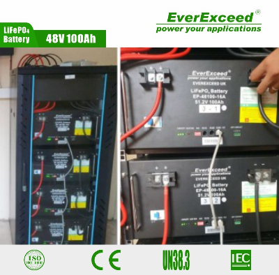 Everexceed 6000+ Cycle Times 48V 100ah Rechargeable LiFePO4 Lithium Ion Solar BatteryProduct DescriptionEverExceed solar LiFePO4 battery system is specially optimized for PV application, mainly used for the energy store battery of Photovoltaic system; its advance intelligent lithium battery management technology to ensure the intelligent automatic management. With "Energy transfer" balanced patented technology, EverExceed lithium iron phosphate provide high efficiency balanced and prolong system operate life. Based on its own technical features as high capacity, high voltage and free of pollution, the lithium iron battery is widely concerned by people with a rapid development stance. It will be the first choice for the high requirement energy store battery solution. FeaturesHigh cycle life and deep cycle abilityHigh reliabilityHigh cycle times and longer service life of >6000 cycles@80% DOD ;Superior DOD (100% over lead acid bateries; Excellent high temperature performance, ultra low life decay rate in operating when harsh environment; Ultra low self discharge rate