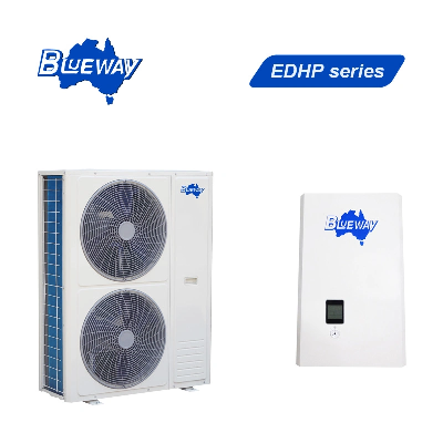 PRODUCTION DESCRIPTION R32 or R410a DC Inverter Heat Pump (ErP A++, ErP A+++) with EVI compressor technology and full inverter technology for extremely cold area and high outlet water temperature. Equipped with heating, cooling and domestic hot water functions for families, apartments, small industrial sites, etc. Additionally, it can work with solar, boiler or electric heater according to the practical condition of the heating system. With R410a refrigerant, most advance inverter technology & intelligent defrost function to work well in -35ºC, which is much more higher efficiency than normal air source heat pump. KEY FEATURES 1) Extended working range down to -35°C ambient (low ambient type)2) 5 modes: heating only, heating+DHW, cooling only, cooling+DHW, DHW only3) Low running costs and high efficiency4) Long-life and corrosion resistant composite cabinet stands up to severe climates5) Famous compressor ensures outstanding performance and durability6) LCD touch screen with self-diagnostic control function7) With control output for three-way valve8) Easy operation and simple installation9) WIFI control function is optional KEY COMPONENTSHigh Energy Saving & High Power Technology Blueway has its own R&D team & professional test laboratory, which has developed mature control system. Inverter units with accurate temperature control by DC inverter technology, with multi-protection, automatic defrost, WI-FI control function, etc.Intelligent Control The units are supplied with micro processor based digital controller with LCD touch display. The controller is programmed to provide a maximum protection to the heat pump system and accurate temperature control. The control panel is completely factory wired with all accessories and terminals included.SWEP Plate Heat ExchangerHigh corrosion resistanceHigh thermal efficiencyHigh working temperature High Efficiency Compressor High efficienty and energy savingQuiet operation due to less moving partsAdopt famous brand rotary or scroll compressorHigh Efficiency Class A Pump Energy saving pump with constant volume or pressure adjustment function. German Wilo or Chinese Shinoo water pump is optional. APPLICATION DIAGRAMSplit Type:Monoblock Type: TECHNICAL SPECIFICATIONSOptions: EVI Low Ambient & Normal Ambient Type (Split & Monoblock Type)DC Inverter Heat Pump (Split Type)ModelEDHP-09SEDHP-14SEDHP-16SEDHP-24SEDHP-30SHP356810Power supplyIndoor unitV/Hz/Ph220-240/50/1, 380-415/50/3Outdoor unitV/Hz/Ph220-240/50/1 380-415/50/3+7°C/35°CFloor heating Heating capacitykW/h914 16 24 30Power inputkW23.043.55.47.3COP-4.54.64.564.454.1+2°C/35°C Floor heatingHeating capacitykW/h8.512.514.321.728Power inputkW2.183.133.7 5.5 7.2COP-3.94.0 3.924.0 3.9-7°C/35°CFloor heatingHeating capacitykW/h7.1111318.924Power inputkW2.43.614.46.528COP-2.963.052.952.93+7°C/45°CRadiatorsHeating capacitykW/h8.5131520.629Power inputkW2.43.64.415.98.5COP-3.543.623.43.53.4 -7°C/45°CRadiatorsHeating capacitykW/h6.810.212.518.0 22Power inputkW2.94.235.27.69.6COP-2.342.412.42.372.3+7°C/55°CHot waterHeating capacitykW/h612142024Power inputkW2.2644.917.19.2COP-2.6532.852.82.6 -12°C/41°CFloor heatingHeating capacitykW/h610.511.517.8 22Power inputkW2.64.55.17.749.6COP-2.32.362.262.32.3+35°C/7°CFan coilCooling capacitykW/h711132024Power inputkW2.63.954.817.259.2EER-2.72.82.72.762.6Energy efficiency classFloor heating-A++A++A++A++A+DHW mode-A+A+A+A+A+Heating operation rangeAmbient°C-25~25Water side°C18~60Cooling operation rangeAmbient°C10~43Water side°C7~22Domestic hot water operation rangeAmbient°C-25~35Water side°C25~60Rated water flow ratem³/h1.5 2.4 2.8 4.1 5.2 Rated pressure dropkPa3045454047Max. working pressureRefrigerantBar4444444444WaterBar77777Controller-Micro processor based digital wire controller with LCD displayExternal cabinet-Galvanized steel with powder coatingCompressorType-RotaryRotary/ScrollQty.Nos.11111Refrigerant-R32/R410a Water heat exchanger-SUS 316 Brazed plate heat exchangerElectric heaterkW3/66Water pump-DC type, Wilo/ShinhooShinhooExpansion tankL5810Water connectionInlet&Outletinch1"1"1"1"1-1/4"Noise levelIndoor UnitdB(A)4242424242Outdoor UnitdB(A)5256585961Net dimension (W*D*H)Indoor Unitmm522*296*863.5522*296*863.5522*296*863.5522*296*863.5602*308*880Outdoor Unitmm950*445*800976*410*1273940*448*13651150*480*15651405*590*1626Net weightIndoor Unitkg5555555570Outdoor Unitkg5890100120175Rough loading20GP/40GP/40HQset24/48/4823/48/5223/48/5219/41/4112/27/27Notes:1.The values of heating(cooling) capacity/power input/COP(EER) are based on measurement of EN14511 standard.Usage environment, such as operation of the heat pump, room temperature and controller adjustments, may cause disparities between practically determined and these values; 2.Sound pressure level measured at distance of 1m from the device;