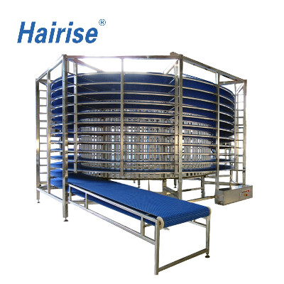 Spiral conveyor is a device that uses the rotation of a screw shaft to drive materials forward. It is mainly used for horizontal or inclined conveying of powdered, granular, and small materials, such as coal, ash, slag, cement, etc.Spiral conveyors are widely used in various fields, with the following main characteristics:Simple structure and easy maintenance.It can be transported horizontally, obliquely, or vertically.The height of the unloading point can be adjusted for easy unloading.Strong sealing performance, capable of sealing and conveying, preventing material from flying.It can be connected and fixed between other devices to form a continuous production line.Spiral conveyors are mainly used in industries such as construction, mining, metallurgy, chemical, pharmaceutical, food, etc., to transport various dry powder, granular, and small materials, such as cement, mineral powder, coal slag, lime, etc.Hairise modular belt sprial conveyor wtih FDA& Gsg certificate  Product  nameModular belt spiral conveyorProduction capacity7000 PCS one monthVoltage220V/380VDiameter range1.5m to 12m or moreMaterialThe mesh belt is made of 304 stainless steel and the skeleton is made of 304 and 201 stainless steel square tubesBelt width range200 mm-1300 mmBelt length range50 meters - 1200 metersTower diameter range1.5-12 metersLayer heightSpiral tower up to 6 metersTower layer range1-40 layersEntrance&exit directionLow inlet high outlet, high inlet low outlet, two inlet and two outlet, three inlet and three outlet and so onUsageBiscuit, Cake, Pizza, Bread, Hambguer, Loaf, BaguetteDescriptionRequisite cooling equipment for bread automatic production line widely used in large-scale bread production enterprises in various countries and regions.RF takes the lead in domestic bakery industry on specialize production and promotion of spiral cooling tower manufacturers. The products throughout the domestic numerous well-known bread production enterprises, and bulk exported to many countries abroad, which make the enterprise with more continuous and automatic production. The product greatly increased the production efficiency; control the product with consistent time from baking to cooling till packing, greatly improved the product quality.Spiral cooling tower choose stainless steel spiral mesh belt or PP, POM food-grade engineering plastic mesh belt carrier. Mesh belt width 200-1300 mm; distance between layers and layer numbers in accordance with the capacity; cooling time 20-120 min.FeaturesBig cooling capacity. Directly cooling hamburger, toast and sweet bread; cooling moon cakes, milky buns with tray; flexible customization, design diameter and mesh belt according to the site and capacity; up input down output or down input up output for singApplicationsFor food factory-High efficiency, for various food like cake, pizza,tea or some drink.For bakery factory-Can save some space and time, can cooling hamburger, toast or french bread same time.For others-Cooling meat, fish, vegetable, fruit and so on.AdvantagesHigh strength food grade SUS304 stainless steel spiral belt, with side guards at both sides, prevent the products from falling down.Tension device of spiral belt adopts floating shaft, which can automatically adjust the tightness of the mesh belt and ensure the smooth and reliable operation of the mesh belt when the temperature changes or the force changes.Low temperature special gear reducer motor, stable and reliable transmission system, multiple alarm control points to ensure smooth operation of the whole machine.Custom design of various specifications and varieties of 250-5000KG/H, and we can also make special designs according to the requirements of customers.Advantages of the Hairise products:1.this products are convenient to assembly and maintain2.All color could be available3.this modular conveyor belt can bear High mechanical strength4.this modular conveyor belt has Excellent product handling performance5.these modular conveyor belts are wear resistance and Oil Resistant6.we are a professional conveyor system manufacturer, our product line contains modular belt, slat top chain, conveyor spare parts, conveyor system.7.we can provide good after-sale service.8.every product can be customized Application:Bakery, Dairy, Fruit, and VegetableWe have extensive experience in developing specialized solutions tailored to the needs of many different Bakery industry segments: bread and bun, fresh pastry (oven and fried pastry), pizza, pasta (fresh and dry), frozen bread, frozen pastry, cookies, and crackers, with our material handling equipment conveyor systems conveyor plastic modular belt conveyor you can get surprised!Meat Poultry SeafoodWith belts and accessories designed to meet the specific needs of fruit and vegetable processing and packaging applications, Hairise is committed to helping customers achieve their operational and business goals.Hairise continues to develop new and better ways for customers to increase throug
