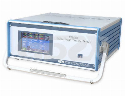 Three Phase Program-controlled Precision Test Power SourceIntroduction ZX3030C Portable Three Phase Testing Device adopts luxurious aluminum alloy case and detachable aluminum alloy hanging table frame. It is suitable for the inspection of various three-phase electric energy meters of class 1.0 and below. Technical parameters 1. Instrument accuracy level: 0.05 or 0.12. PC connection terminal:RS232 communication interface3. Three phase source parameters 1)output voltage: 3*57.7V Y 3*100V 3*220V Y 3*380V Regulation range: 0~120% continuously adjustable, fineness:better than 0.01%2)Output currentRange: 25mA,0.1A,1A,5A,25A,100AMinimum output current: 1mA ( accuracy