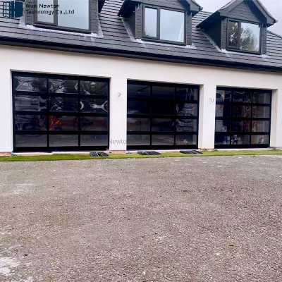 Black aluminum frame overhead tempered glass panel sectional garage door - Product overviewAnti-pinch full vision aluminium sectional door is composed of segmented aluminiumn alloy door panel, which run on the track system suitable for door opening, to realize the balance through the balance system. The door body is fully transparent aluminium alloy door panel, and its design goal is for thoese customers who need large dimension, high precision requirements, beautiful appearance and high visibility requirements. It is widely used in high-end auto 4S shops and all types of business premises, and the lifting method can be customized according to the autual sitation of the building. - Garage door structureThe durability, stability and safety of the garage door are the most important things which we concern about, in order to meet hat, we supply high quality hardware to meet the latest EN13241-1 standards of Europe. Tracks, hinges and rackets are made of hot-dipped galvanized steel, which can be used for a longtime without rusting. All accessories are designed and manufactured according to the international standards to ensure the safety and stability. The whole work in company carried out according to the high level manufacturing processes and lean management to guarantee the product meet requirements of design, the accuracy of ths size and the great appearance- Garage door opener MODEL600N800N1000N1200NVoltage range/rated frequency220~240V AC, 50/60HzRated power200W235W245W260WMaximum lifting force600N800N1000N1200NDoor opening speed180mm/sLamp typeLEDLighting time3 minutesCoding typeRolling codeRadio frequency433.92 MHz or other requirementsAmbient temperature-20~+40°CRelative humidity